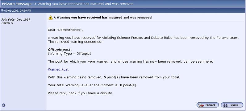 I've gotten the PM (attached image) everyday since the month started at exactly 9:59 PM every night (Mountain Time). It's like there is no sender the only info on the side is "Join Date: December 1969 >Posts: 0" so I can't reply like it says to if I have a problem. 1969? Anyway, what is this?
