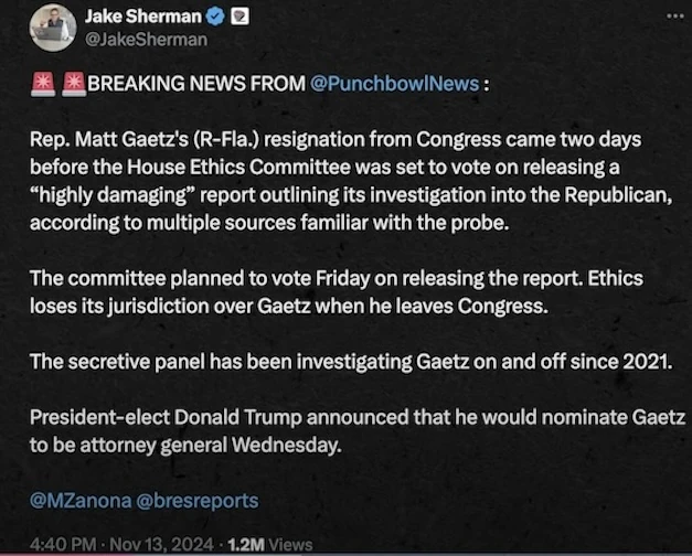 So, Matt Gaetz resigns from Congress on the back of his AG pick by Trump just two days before a *Republican* controlled Congressional House Ethics Committee was due to vote on releasing a highly damaging report on its investigation into accusations of sex-trafficking and drug abuse against him on Friday. Funny that ..