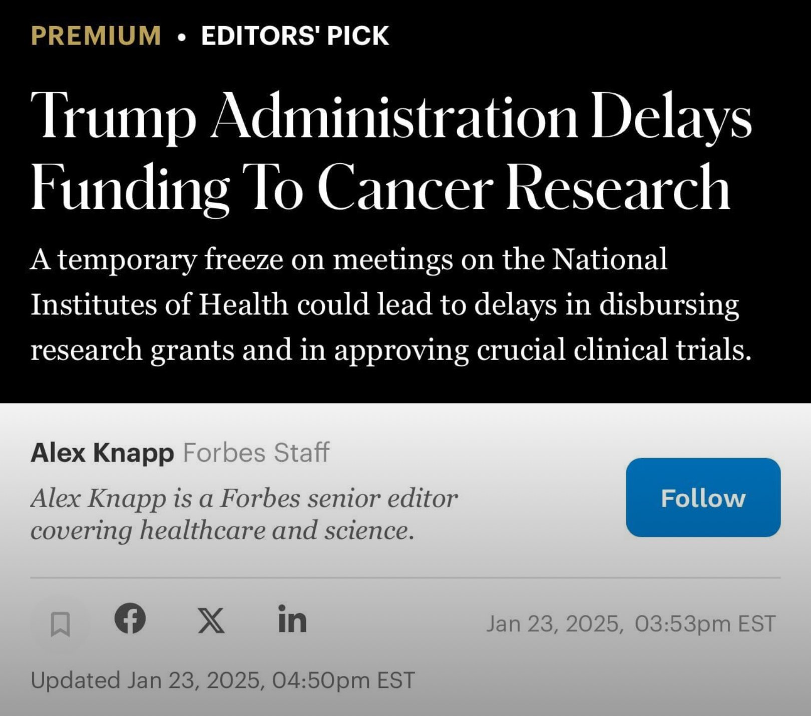 Trump’s executive order for the NIH to freeze meetings, travel, communications, and hiring throws the agency into chaos, interrupting research into cancer treatments, antibiotics, infections and more.