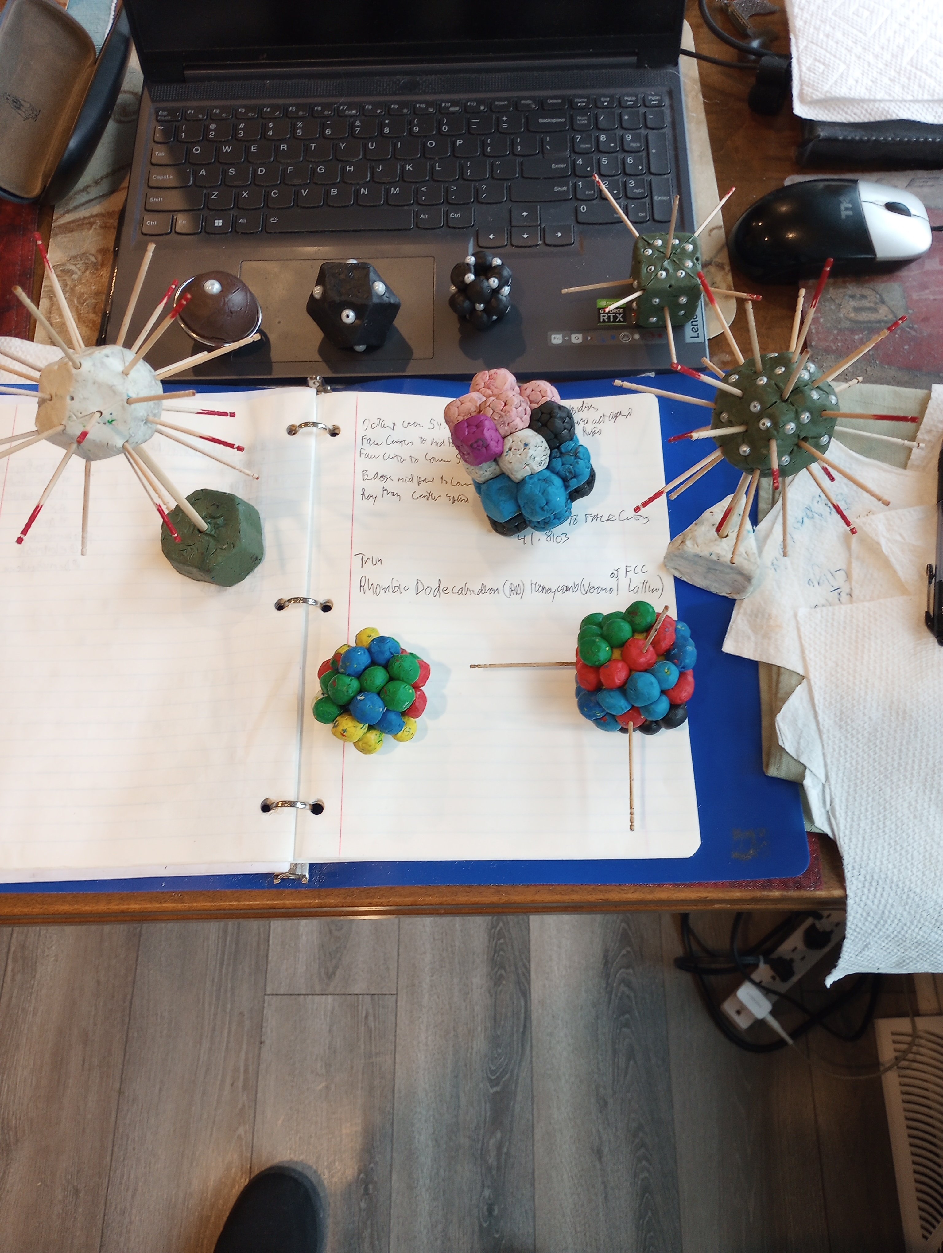 notice the 13 axes shown by the toothpicks in the white Rhombic Dodecahedron are the exact same 13 axes shown with the green Truncated Octagon with the pearls embedded on the edges of the marked Rhombic Dodecahedron on the surface of the Truncated Octagon. The pearls form 4 8 pearl rings, exactly describing an electron shell Notice the red tipped toothpicks show the 6 axes of the Rhombic Dodecahedron going through the center of the faces and the unmarked toothpicks show the 7 axes of the Truncated Octagon going through the 8 hex faces and 6 square faces. For alignment with the Cartesian Space the Cuboctahedron shell of clay balls with black red and green hexagonal planes shown has toothpicks aligned with the xyz axes of Cartesian Space.