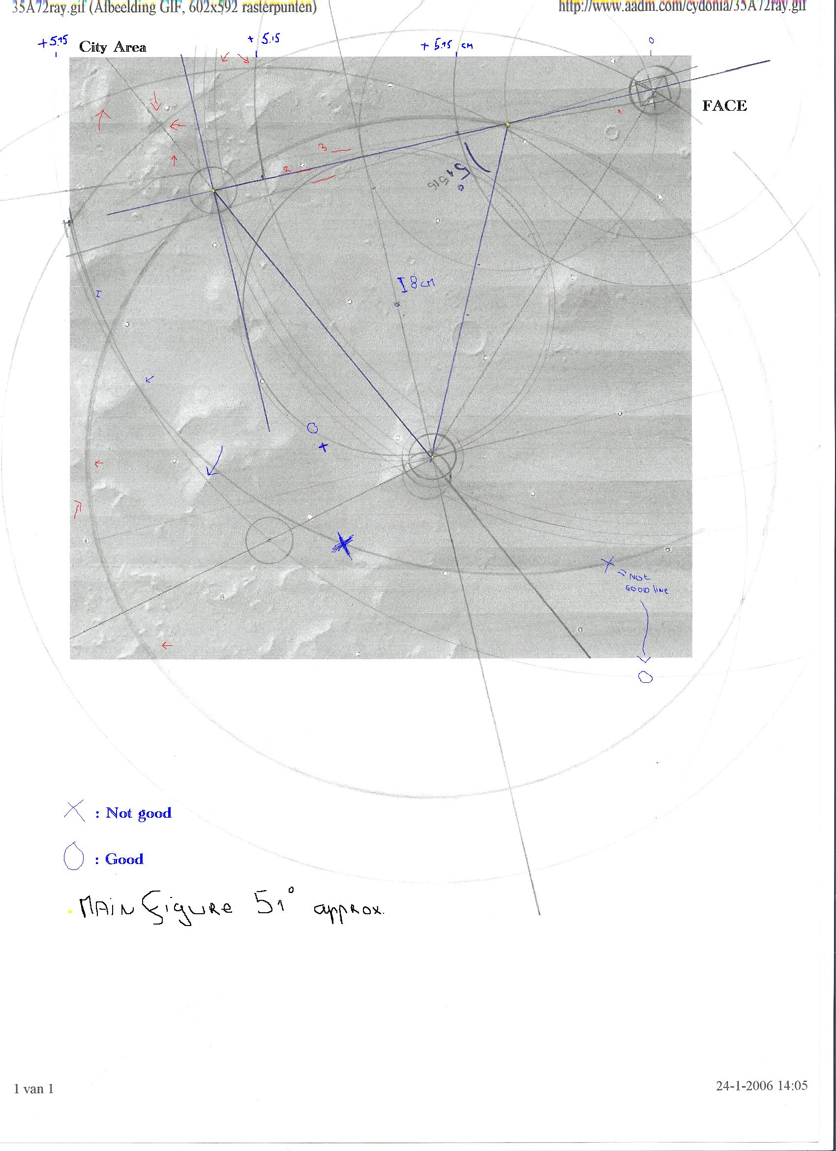 it's weird that the degree of the triangle is +- 51.15, matches the, 3 circles EXACLY, that I drew way before i found the piramid in the center, blue pen .. If you start at the center of the face, and add 5.15 cm to it, straight to the city area's left piramid. ( marked yellow dot ), The three marked circles are the +5.15 mark everytime ..