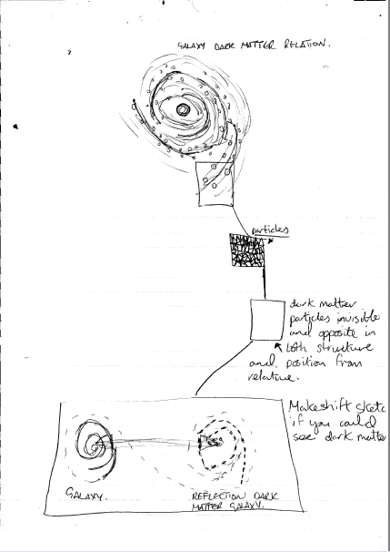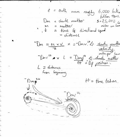 dark matter is a complex negative energy. It lies at a parallel opposite of the actual matter we know i.e earth for instance. earth has a tiny mass in comparison to the universe, as does its counterpart dark matter, its opposite. So using my equasion one can work out its exact location and speed, energy, time taken to anti gravitise against the earth. Anti gravitation is a theory of mine which includes anti pressures of the field it is within. Therefore the position of the earth is the negative position of its dark matter counter part, dark matter is invisible as it has no weight and therefore no visibility for detection. But using my equasions one can see that it is there, if we were to send a probe to this location we could be sure that it was there. We can see the effects of its gravitational (anti) flux against celestrial objects in our solar system. Once i have established the exact location to the metre i am going to send this data to astrologers all over the worls. They can then watch this location and see waht type of efect it has with it's surroundings. I am confident that they will be in for a pleasant suprise, my equasions can be found on my site including there descriptions on how to use them. I look forward in hearing scientists feedback on these theories.