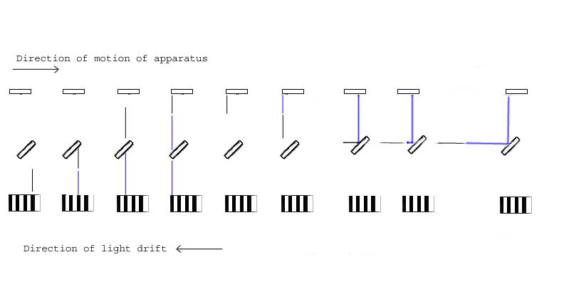 Let us presume that the light path remains at rest (in respect to the direction of motion of the system) as it leaves the light source. Thus as the light moves along it remains covering the same distance as in in the rest diagram, traveling in a strait line. As the light moves there occurs a very slight drift in the light getting left behind. In this thought experiment, only just a slight drift to cause it to impact the mirror just millimeters the the 'left' in comparison to when it is at rest.
