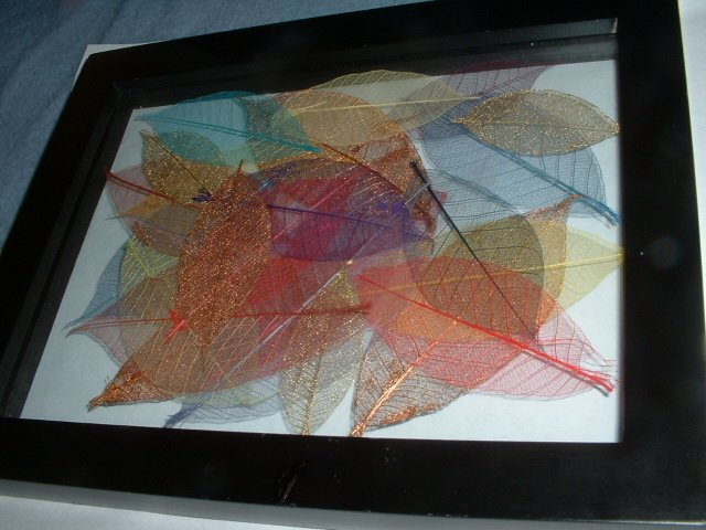 At a store, I found framed between two glasses, a bunch of tree leaves missing its 'green' tissue, and nicely dyed and impregnated in several colors, and gold? powder. Yes, bought it. Too nice (or unique) to pass.