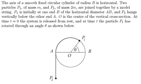 and setting [math]{{\partial L}\over{\partial\theta}}={d\over{dt}}{{\partial L}\over{\partial \dot\theta}}[/math], we find the equation of motion up to the moment when P1 breaks away from the cylinder: