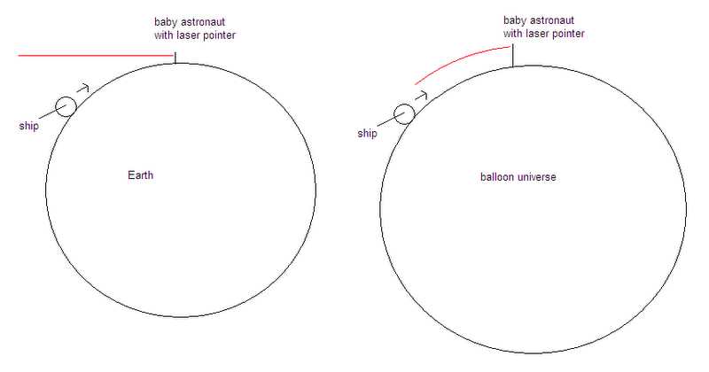 4. If space is really self-contained, and you'll appear at your starting point if you traveled in a straight line, isn't this compatible with how the illusion of a ship rising on the ocean horizon is used to explain the Earth's curvature? If you could observe a spaceship far away on the universe's balloon shape, wouldn't you see the craft "rising" out of empty space?