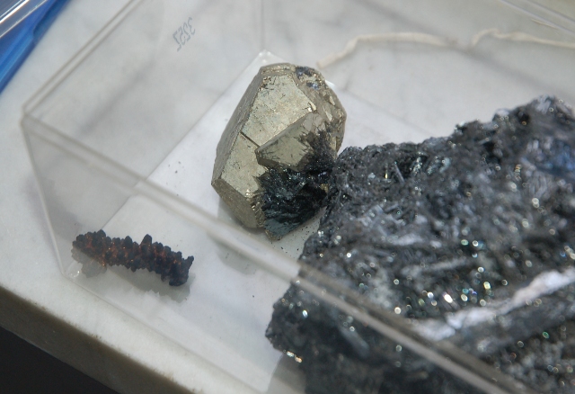 I have been less lucky in locating antimonite. I only found a small crystal, same size as the pyrites, for $20. But I bought two crystals of galena (PbS). So I setup 2 small sealed boxes, one with galena and pyrite, and one with pyrite and antimonite. I would like to find other antimonite crystals, to experiment with adding a small piece of metallic copper, and varying humidity and temperature in the boxes... We'll see what happens. Too bad it'll be a "long-term" experiment! :) But I REEEALLY would like to know what's happening here...
