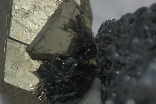 Hmm, so you think the black stuff on the pyrite is made of iron and sulfur... so, would some sulfur have left the pyrite leaving the black stuff behind? But that's so strange, as the new stuff on the pyrite looks *exactly* like the antimonite! Same color, same crystal shape, same "glossy" look...