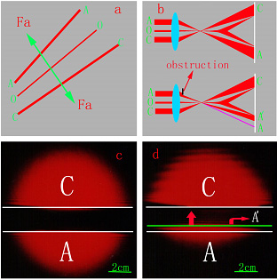 Figure.9. Picture a is the state of force in the three light beams A, O, and C; picture b shows the section of movement of light beams A, O, and C; picture c is the photograph of light beams A, and C when they are first on the screen; picture d is the photograph when the outer part of light beam A is removed. In picture d, the white line is the original site of light beam A when outside light beam has not been removed; the green line is the site of light beam A when its outside fringe has been removed, and the red arrow is the direction of the light beam A accepting this force; The purple line in picture b is the moving track of light beam A when outer light beam has not been removed.