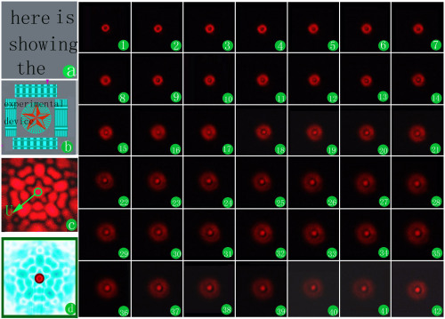 Figure.3. Picture a shows the device of the experiment. Picture c show the ring site in light beam O, and pictures 1-42 are photographs showing that the form. of light beam O has been changed from a circle to a pentagon by gravitation which moving photons producing in the moving forward light beam.
