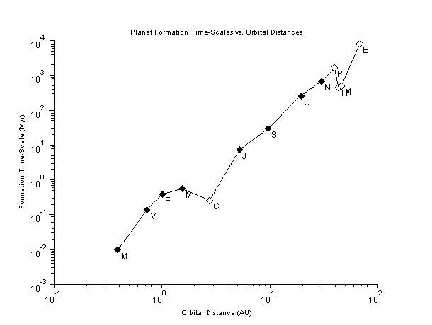 Planet Formation Time-Scales are plotted against Planet Orbital Distances in the attached figure. We find that: