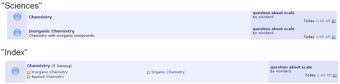 In the "sciences" list, they all seem equal. However, when you click "Chemistry", it turns out that the other 3 chemistry forums are sub-forums of the main chemistry forum. This is supported by the main index page. The fact that sciences and the main index treat the "chemistry" forum different seems inconsistent to me.