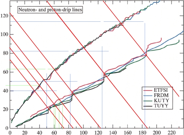 The image id=309 shows proton and neutron drip lines calculated for four different nuclear models. The plots are got from a work of Uno, a Japanese scientist and burocrat, and the whole image is given to suplement the ones in the preprints. 0405076 uses only the very simple drip lines from a 1993 preprint on the FRDM mass model, and EXT-2004-048 uses a different (russian?) model that calculates 2-p and 2-n drips, but in exchange it also estimates the proton and neutron skin radius.
