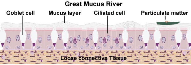 In the stomach and intestinal tract are many cells, many of which are goblet cells, whose function is to produce mucus, but here it is a lubricant for moving food and provides protection for the epithelial layer. Digestive enzymes and acids could digest the epithelia without some protection. Here the mucus interacts and is a part of an epithelia cell surface coat (glycocalyx) that both protects the cells while promoting transport of digested food (e.g. sugars, amino acids, fatty acids) from the GI lumen into the epithelial cells for use by the body. Below is an illustration of the great mucus river. SM