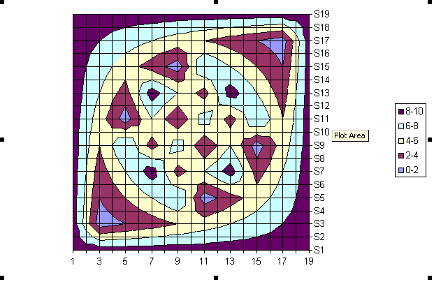 All the values in the matrix become a "height", and Excel creates a bunch of lines that connect where the same height occurs. It creates a large number of data-points that are NOT in the matrix itself. With the right function, I am sure you could even make the "Eye" more smooth, and looking more natural.
