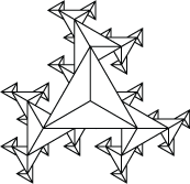 I've been working on the ideas for a theoretical model for gravity, mass and inertia that is based on the idea that all particles are composed of 3-dimensional fractals. The fractal is built of tetrahedrons with six sides made of stretchy strings. The center of the fractal is a single tetrahedron so there are four faces or directions in which the fractal grows. The fractal branches out spherically from the base tetrahedron, with each tetrahedron connected to one larger tetrahedron, and three smaller tetrahedrons. The size of the tetrahedrons is reduced at each level by a factor of [math]1/\sqrt{3}[/math], the size of the strings is likewise reduced by the same factor. So the combined spring constant, k, for any given level would be equal to the sum of the constants for the levels below it. (See the attached diagram for a left-handed fractal in one of the four directions coming off the base tetrahedron).