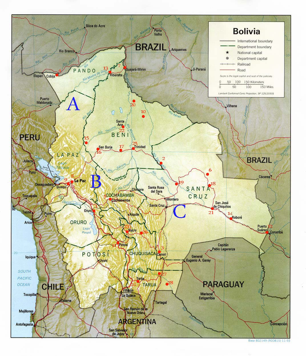 In the case of Bolivia, Grid A encompasses from 65-700 West and 10-150 South. Grid B is from 65-700 West and 15-200 South and Grid C is from 60-650 West and 15-200 South.