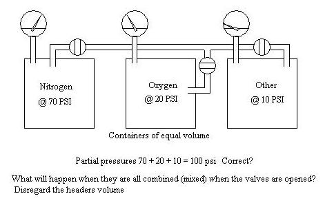 If the nitrogen is at 70% or a partial pressure of 70 psi, and oxygen is at 20% or a partial pressure of 20 psi, plus the rest at 10% or 10 psi, then these partial pressures add to 100 % or 100psi, correct? 70+20+10=100 psi