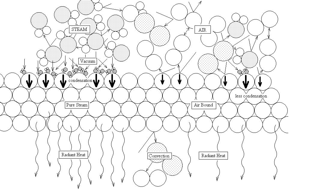 Even though the temperature of both the air and the steam are the same within the vessel, the rate of heat transfer is reduced proportionally to the amount of air present because of this action of blocking of the steams condensation, with the result of a lower sensible heat at the outside of the exchanger.