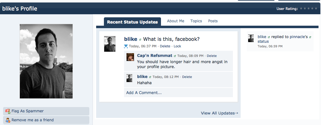 Now you can share status messages, Facebook-style, with other members, and comment on what everyone's doing. Upload a profile picture and let everyone know what you're up to. Post sarcastic messages about the pointlessness of Facebook. Do whatever you want! It's your personal profile.