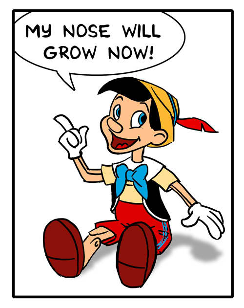 Hes telling the truth because his nose is constantly growing because hes made of atoms (just like everyone else) and so the electrons moves around and one of them goes farther than it more than likley was before.