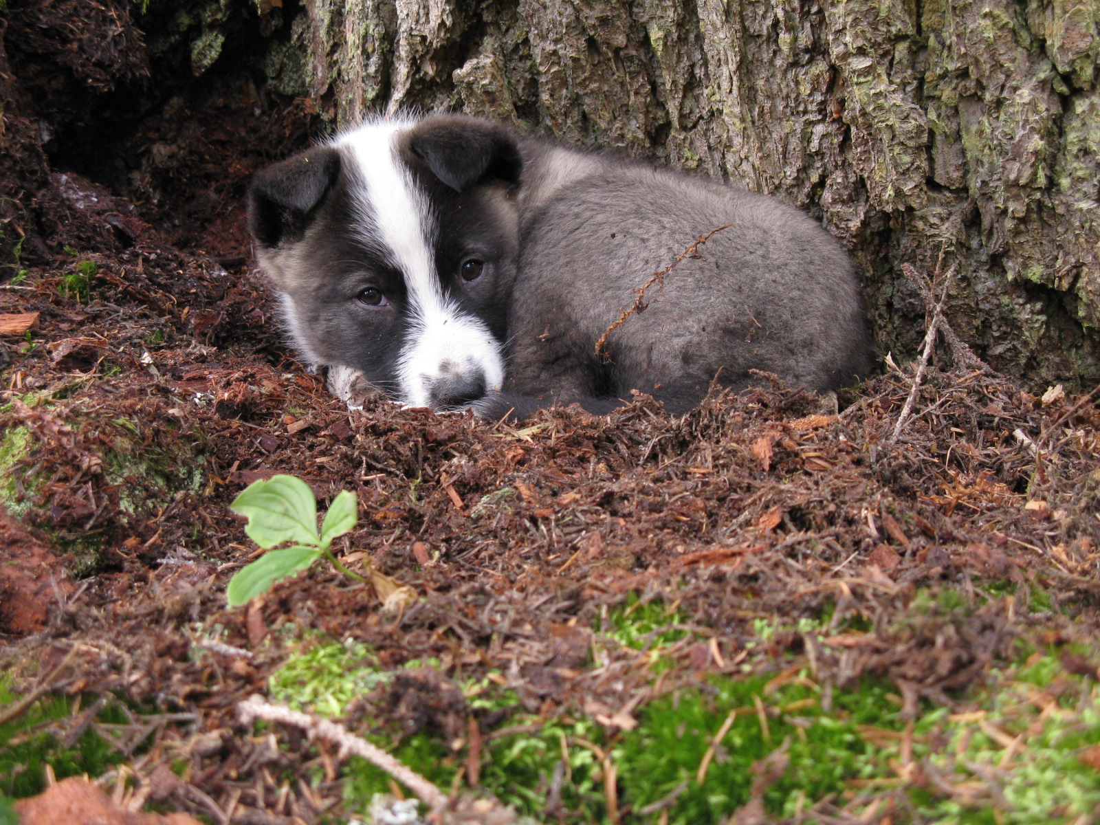 I studied Biology (even have an MS) but have been out of school a long time. Recently I got a pup from a friend's litter that made me think about genetics. The father is a purebred Karelian Bear Dog (KBD). The mother is a Golden Retreiver (GR) that supposedly also has some husky although you can't tell- she just looks like a golden retreiver but with a slightly different body. None of the puppies look like a golden retreiver at all. Five of them look just like baby Karelian Bear Dogs. One of them (mine) looks a little bit like a Karelian Bear Dog and a little bit like a husky. Mine is a girl. There is one other girl and four boys.