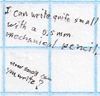 Because I write very small, I also appreciate the capacity of mechanical pencils to make very fine lines. Here's an example of how small I can write. I can't write smaller due to limited ability to see what I'm writing.