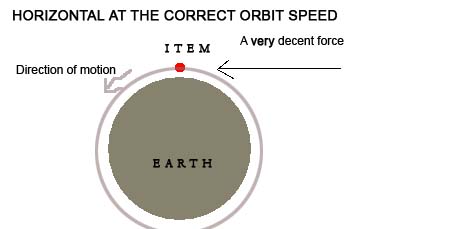 If you give something an extreme x volocity (horizontal to the earth), by the time gravity pulls it down enough towards the earth, the item will have moved far enough in the x direction, that it won't hit the ground, due to the earth being round. If the item moves fast enough, the earth will effectively 'fall away' and there will be no ground for it to hit.