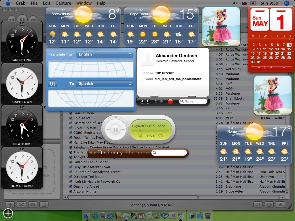 This is what Tiger did to me, reduced me to playing for hours with damn widgets, I need to be doing coursework, NOT fiddling with some DAMN addictive thingys that just appear, and then disappear. Lots of people mention somehting similar for one or two Linux distros, if anyone has them, I wouldn't mind seeing a screenie or two!!! Thanks people.