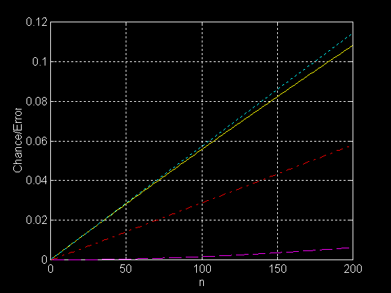I don't know what you mean by "<>"' date=' but I assume that the approximate equality is simply coincidence. You can't find the probability of X after n trials with n*P(X), because otherwise X would have a probability of 1 (or higher!) after a certain number of trials, and that's (somewhat) intuitively not the case. The formula that I used is P(at least one X after n trials) = 1-(1-P(X))^n, which merely approaches 1 as n increases, which makes sense.