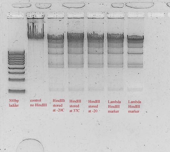 As a control in an experiment, I stored a sample ofrestriction enzyme to be used (3µL of Hind III) in a 37ºC incubator for 5 days- and it still worked just as well in a Lambda digest as samples stored at-20ºC! I wanted to show how the enzyme was inactivated, or at least lessactive, after storage at 37ºC - but couldn't. Why do all digest protocols recommend keeping these enzymes on ice while using them - when 5 days atat 37C didn't have an effect. Any ideas? I performed the test twice, not a pipet error because another control (no HindIII) showed no digestion as expected. I realize heat inactivation is 65C, but expected less activity at least.