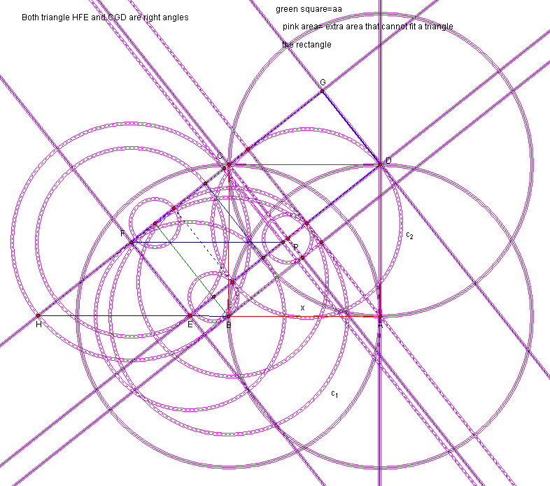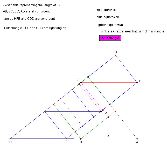 There is a Square (ABCD) with a segment extending from the bottom left hand point (B) a bit more then two times the length of the side (BC) of the square. the point ending this segment (H) has a segment extending from that to the upper left hand point of the square (D) and past that point to a the intersection point (E) of that line and a line perpendicular to that extending from the upper right hand corner of the square (A). There is a segment begining at (A) and ending at (E). There is another point (G) that lies on the intersection of segment (HB) and the line extending from point (A) that is perpendicular to segment (EA). the last point (F) lies on the intersection of segment (HE) and the line perpendicular to segment (HE) extending to (G) the final figure should be a quadrilateral with a square and a rectangle inscribed in it. the goal is to prove that the square is equal in area to the rectangle. Once again if you could help that would be great.