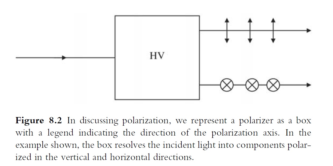 Polarization is a property of an electromagnetic wave, but does it have any relevance to the particle model of light? We could test this by passing very weak light through a polarizer set up like that in Figure 8.2: we would find photons (the particles of light first mentioned in Chapter 2) emerging at random through the two output channels, corresponding to horizontal (H) and vertical (V) polarization, respectively. To confirm that the photons really can be considered as having the property of polarization, we could pass each beam separately through other polarizers also oriented to measure HV polarization. We would find that all the photons emerging from the H channel of the first polarizer would emerge from the H channel of the second one – and similarly for V. This gives us an operational definition of photon polarization: whatever this property may really be, we can say that horizontally and vertically polarized photons are those that emerge from the H and V channels, respectively, of a polarizer.