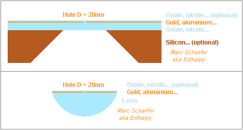 In the option at the lower part of the sketch, the same transparent part that holds the metal film can be a lens as well, to increase the light power density at the hole.