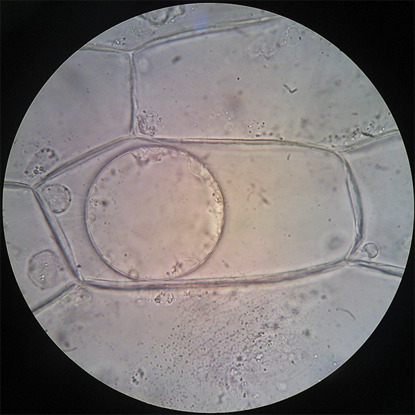Thanks for your response. I've added the same photo without the circles. I don't think it's a trapped air bubble, because all the cells have a circular structure inside them. I also thought it was a vacuole, if the small red circle is the nucleus, it can't be the plasma membrane. Do you still think this is a vacuole?