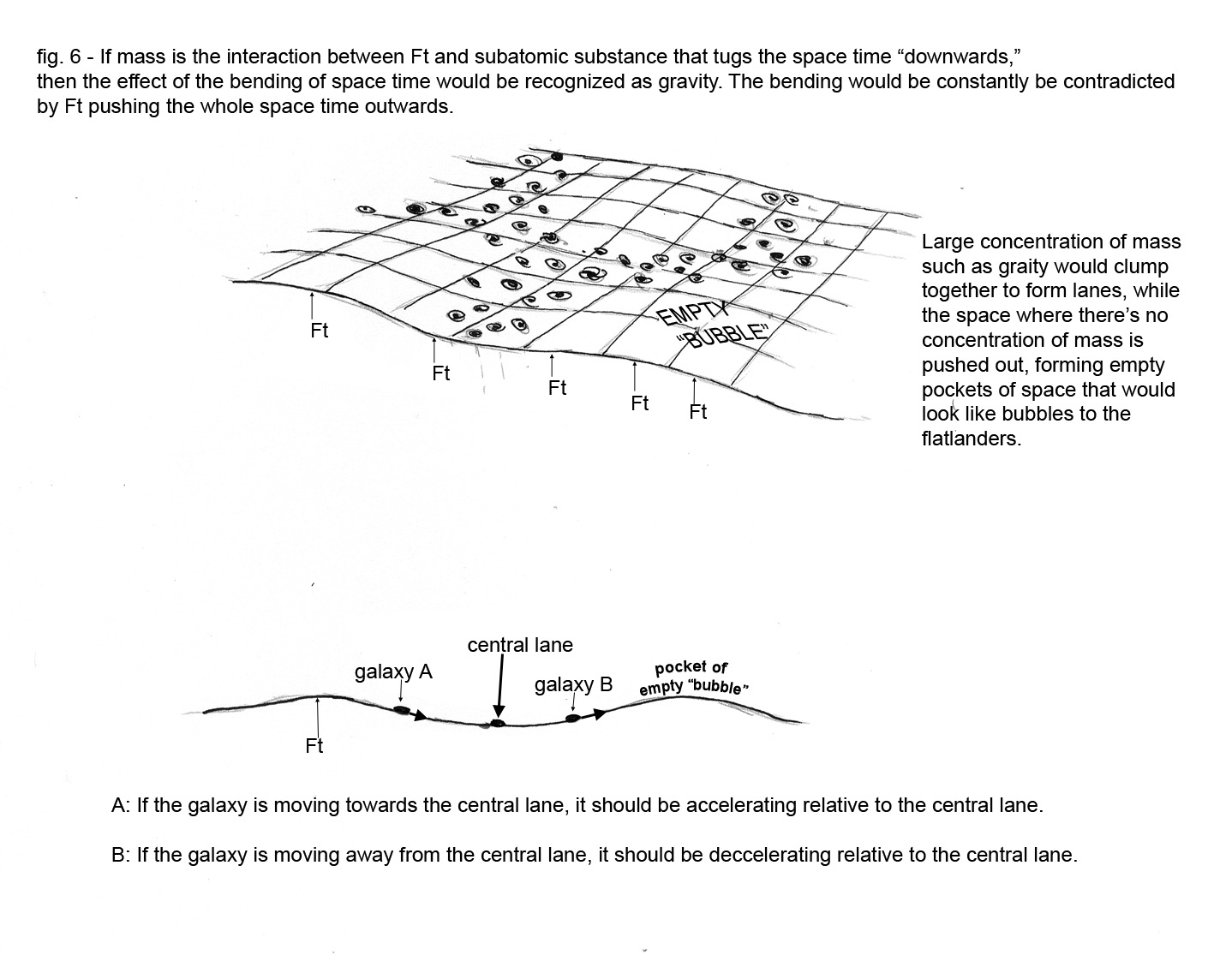 We can make a similar test in our three dimensional world. We can plot out an imaginary tube, which would be more or less cylindrical, based on the distribution of galaxies, with the outer most galaxy of a certain region forming the outer wall of the imaginary tube, and the imaginary central lane on the axis of the imaginary tube. The area outside the imaginary tube would be the empty space. For this speculation to have any merit, it has to be observed that a galaxy that moves towards the central lane should accelerate relative to the imaginary central lane and a galaxy that moves away from the central lane should decelerate relative to the central lane. The galaxy on the outer region of the tube should appear still relative to the position of the central lane.