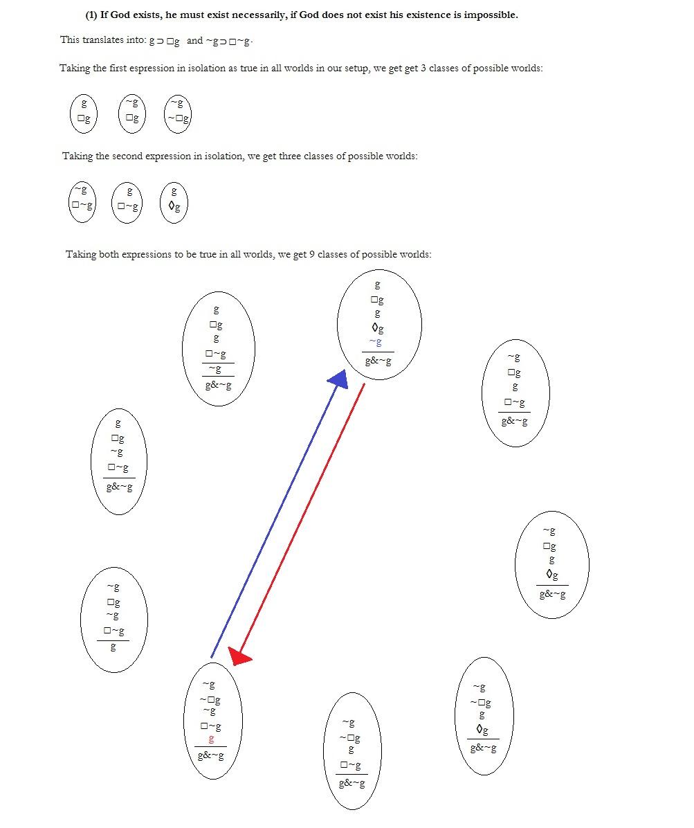 If we take the first conditional ("If God exists, it necessarily exists") to be true, we can break down all of the possible worlds in which it is true into three classes of worlds. If we take the second conditional ("If God doesn't exist, it necessarily doesn't exist), then we also get three classes of possible worlds in which it is true. If we take both to be true, then we get nine classes of possible worlds in which God is either necessary or impossible. When we do that, magic happens. In all but two classes of worlds, the worlds are inconsistent even assuming no world is accessable to any other world. But in the modal logic that deals with necessity, every world is accessable to every other world. From that, all possible worlds in which it is true that God is either necessary or impossible are contradictory.
