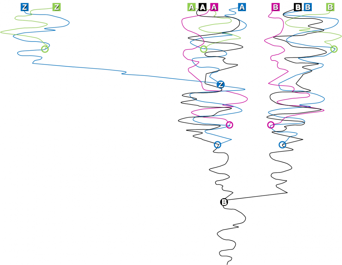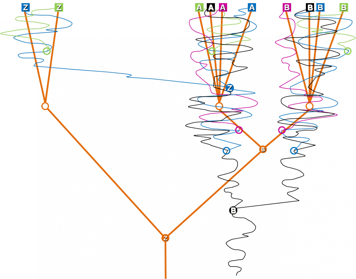 Figure 1: Evolution of paralogous proteins in different species. The different paralogous proteins are indicated as A, B and Z. The different species are indicated by different color (black, blue, magenta and green). Time flows from bottom to top. Horizontal distance means distance in similarity. Protein A and B are functionally closely related, protein Z is functionally more distant. The filled black circle B indicates the point in time in which a copy from A was created and evolved into closely related function B. The filled blue circle Z indicates the point in time in which a copy from A was created and evolved into more distant function Z. The open colored circles indicate the origin of the respective species. Lines are going back and forth horizontally to indicate the more or less random sequence changes in the non-conserved areas of the protein.