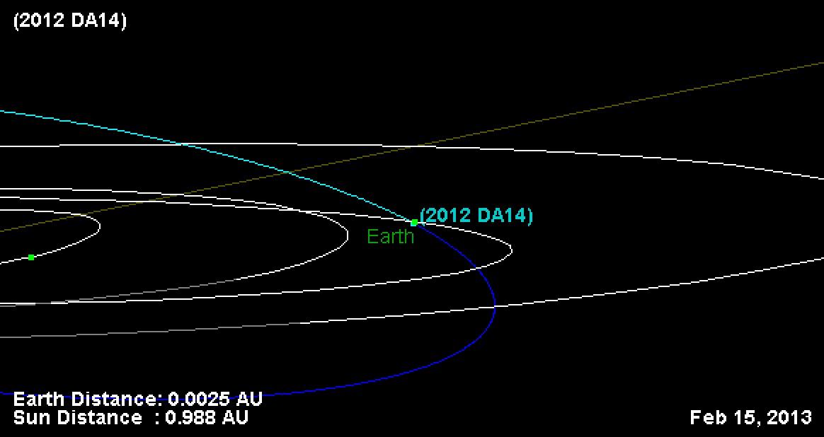 Graphic depicts the trajectory of asteroid 2012 DA14 on Feb 15, 2013. In this view, we are looking down from above Earth's north pole. Image credit: NASA/JPL-Caltech