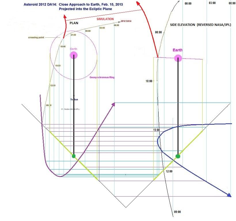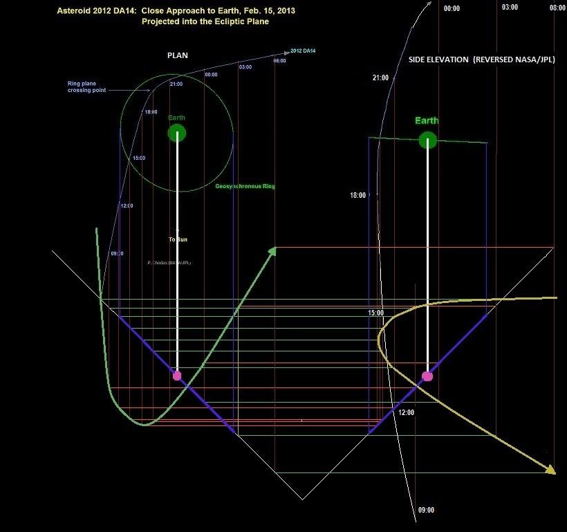 If you rotate the NASA/JPL plan image so that the arrow to the sun aligns with the end elevation images arrow to the sun the path of 2012 DA14 goes from the north and heads towards the south not vice a versa.