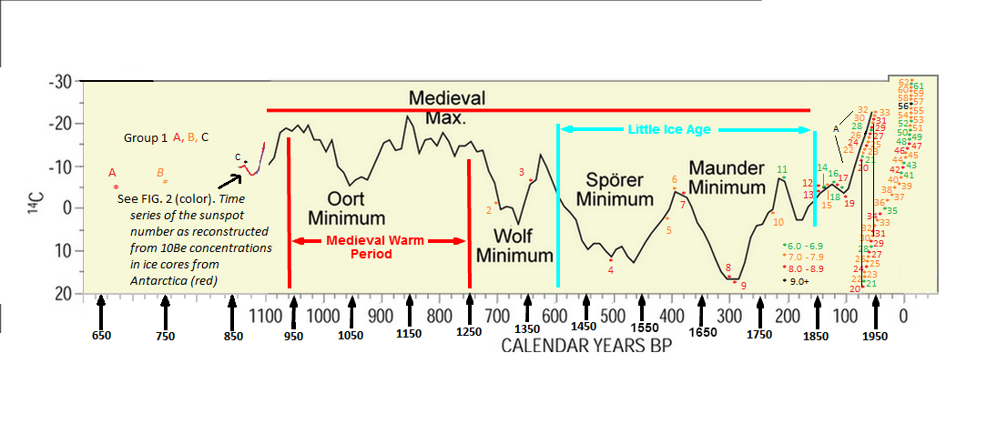 I took this graph above and reversed it to have the most recent events on the right so it could then be more easily compared to the solar magnetic 14C content data in the graph below, that I had previously used to correlate the unusual climate warming of the later part of the 20th century.