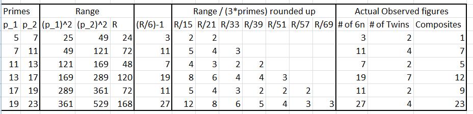 LL is the crucial number. LL is calculated as 2(R/6p) for all primes up to P2. Where R/6p is a fraction we would round up. This is clumsy but it can be refined. It need only produce a lower limit, not a quantity. It becomes increasingly accurate as L grows larger.