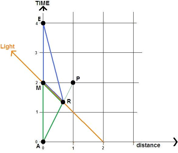 The ship travels 2/3rds of a light-year from earth. It turns around at R and earth views it turn at M (2/3rds of a year later).