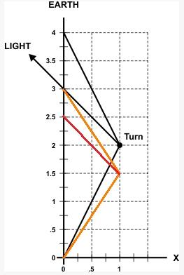 The light from the event marked "turn" reaches earth at t = 3 years.