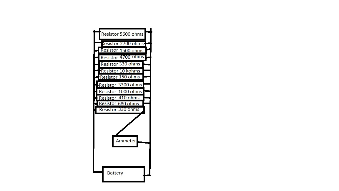 lit up, parallel with 11 resistors with resistances between 100 ohms and 8 kohms.