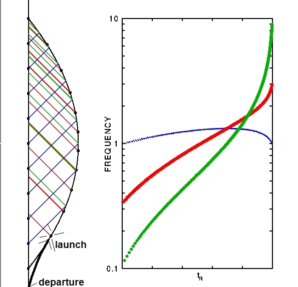 The effect of gravity on clocks was tested to great precision by Vessot etal (1980, PRL, 45 2081) who launched a hydrogen maser straight up at 8.5 km/sec, and watched its frequency change as it coasted up to 10,000 km altitude and then fell back to Earth. The frequency shift due to gravity was 400 parts per trillion at 10,000 km altitude, and the experimental result agreed with the expected shift to within 28 parts per quadrillion. The space-time diagram on the left above shows the rocket going up and then falling back down. The black dots on its worldline are clock ticks, and a flash of light (red) is emitted at each tick. The observed frequency changes dramatically during the flight due to the Doppler shift as well as the gravitational redshift. The red curve on the plot at right shows the observed frequency of flashes from the rocket clock arriving at the the ground observer. In this exaggerated diagram, with a rocket velocity of 0.8c, the frequency changes from 1/3 to 3 times the actual clock frequency. To separate the Doppler shift from the gravitational effect, a transponder was used: the ground station transmitted pulses (blue) at a fixed rate, which were then echoed by the rocket (green) and detected on the ground. The rate of transponded pulses changed from 1/9 to 9 times the transmitted rate due to the double Doppler shift on the round trip. By dividing the rate of pulses from the rocket clock (red curve) by the square root of the rate of transponded pulses (green curve), one gets the blue curve which just shows the gravitational effect on clock rates. Note that shaking during launch may change the frequency of the rocket clock, which will move the blue curve up and down, but will not change its shape. The clock was in free fall during the entire time that data was taken.