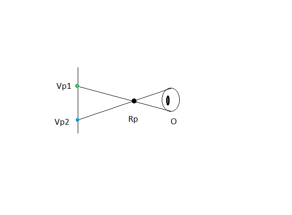 Legend: O = Observer; Rp = Real particle; Vp1, Vp2 = Virtual particles projected on a virtual wall.