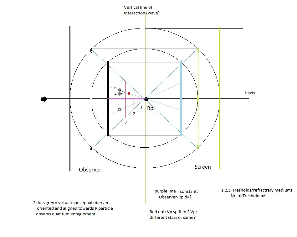 The thickest black line = Observer. The blue vertical line = Projection screen - we see things behind the Real particle.