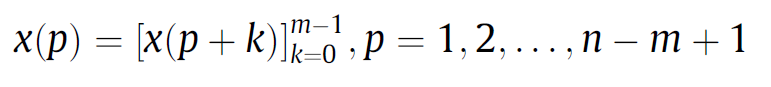 The scalar time seriers {x1,x2,...,xi,...,xn} is embedded in a delayed m-dimensional space, where vectors are constructed as (the formula above).