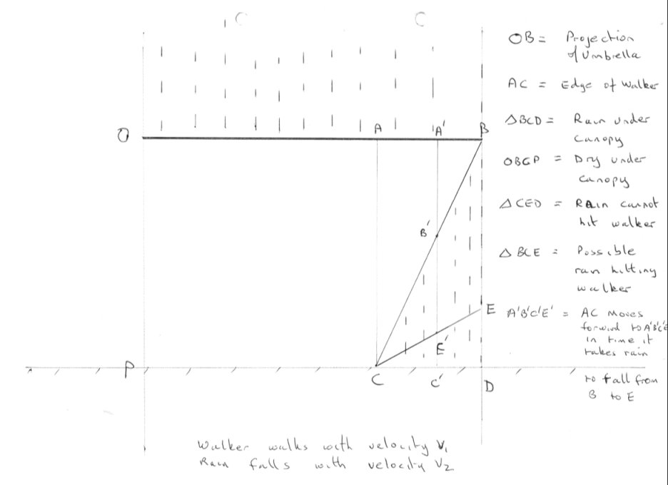3. the rain behind falls in 2 ways A the rain coming directly from the sky, falling at great velocity (nearly vertically for any walker's speed) and B the rain slipping from the umbrella with zero initial velocity at umbrella's edge falling at an angle observable on the diagram.
